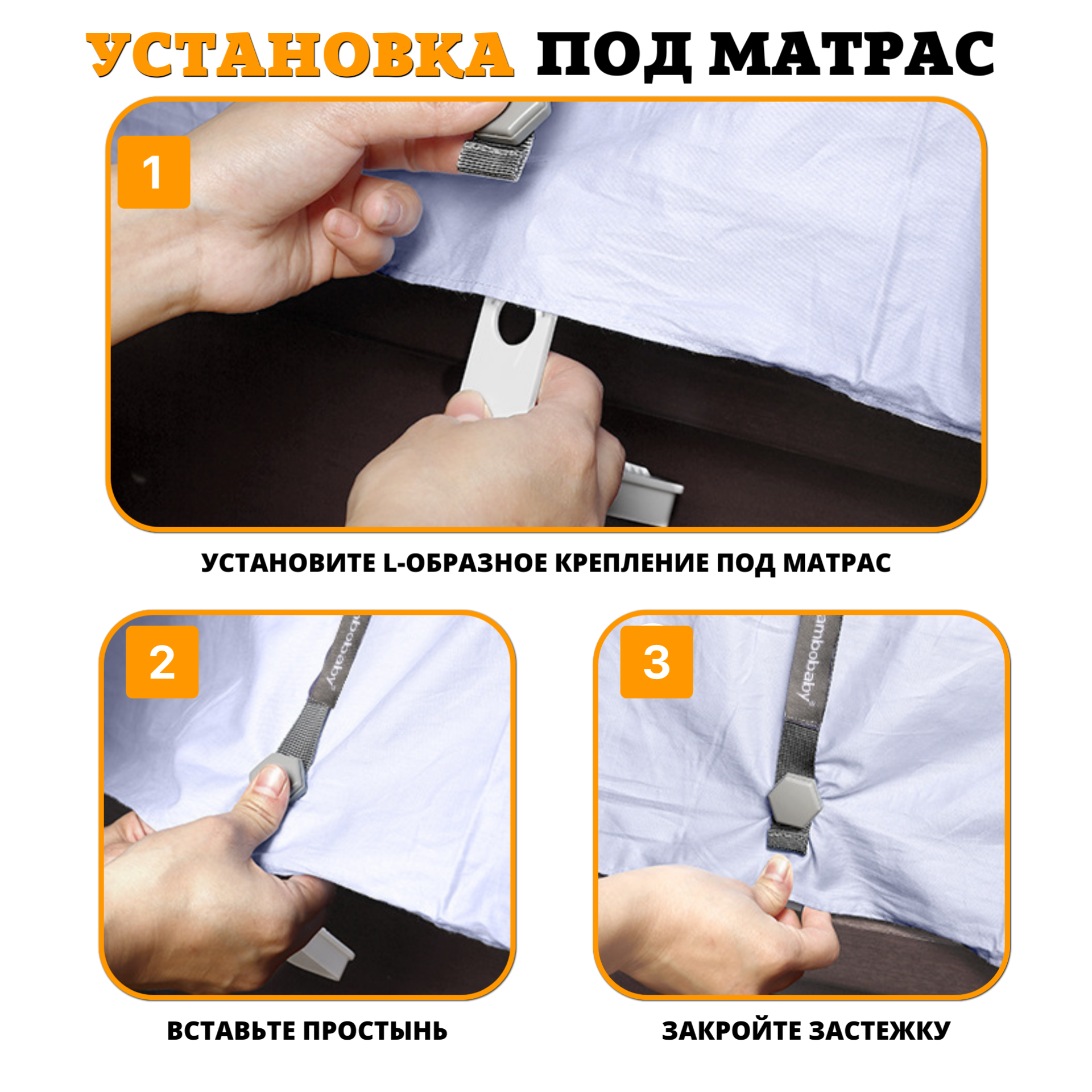 В отличие от других фиксаторов, которые крепятся с помощью игл и повреждают ткань, наши фиксаторы для одеяла представляют собой  регулируемые ремешки и пластиковые зажимы, которые крепятся к углам одеяла и под матрас или к ножке кровати. Это позволяет одеялу оставаться на месте и не соскальзывать во время движения во сне.