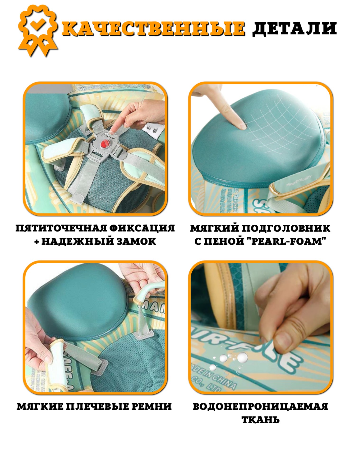 Подголовник препятствует наклону вперед, даёт возможность малышу отдохнуть и не перевернуться в воду. Специально разработанная мягкая ткань без натирания для нежной кожи малыша. Круг может быть использован в течении многих лет.