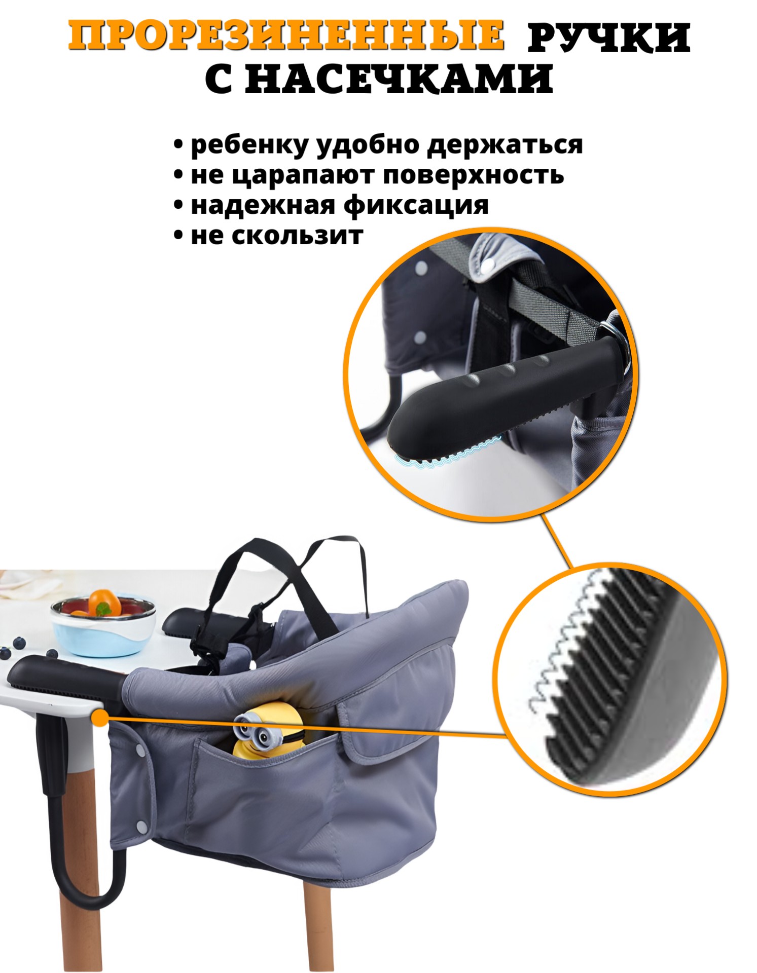 • Стульчик нельзя крепить к столу, поверхность которого выполнена из стекла, поверхность которого легко отсоединяется, к столу с одной центральной ножкой, столу для игр, столу для кемпинга, стол из картона, стол на котором есть скатерть или салфетка  и на любой другой неустойчивой поверхности.