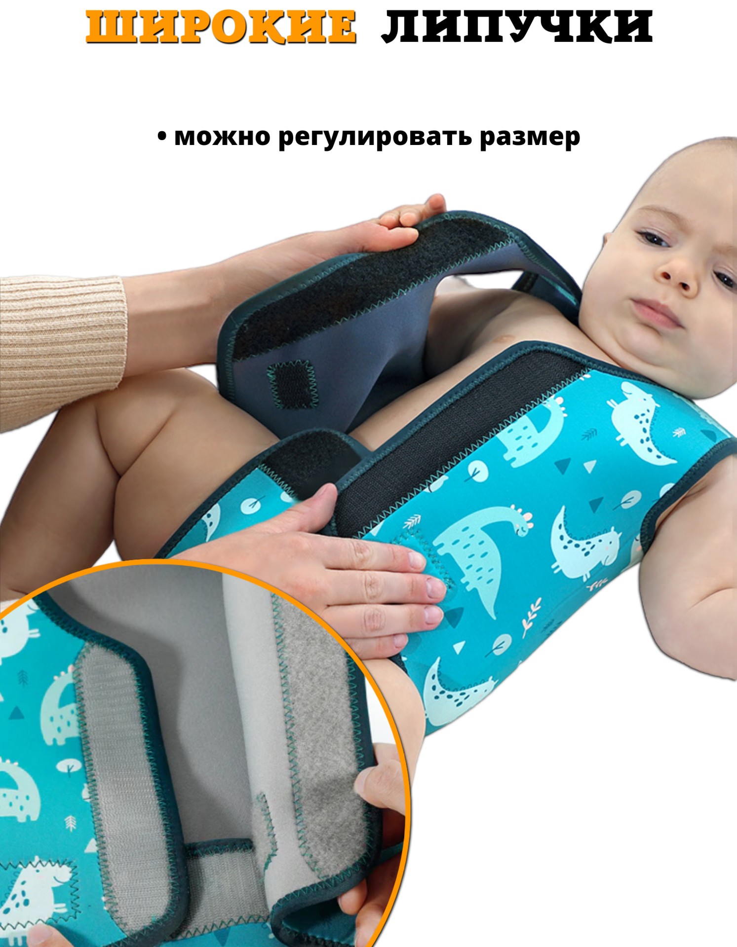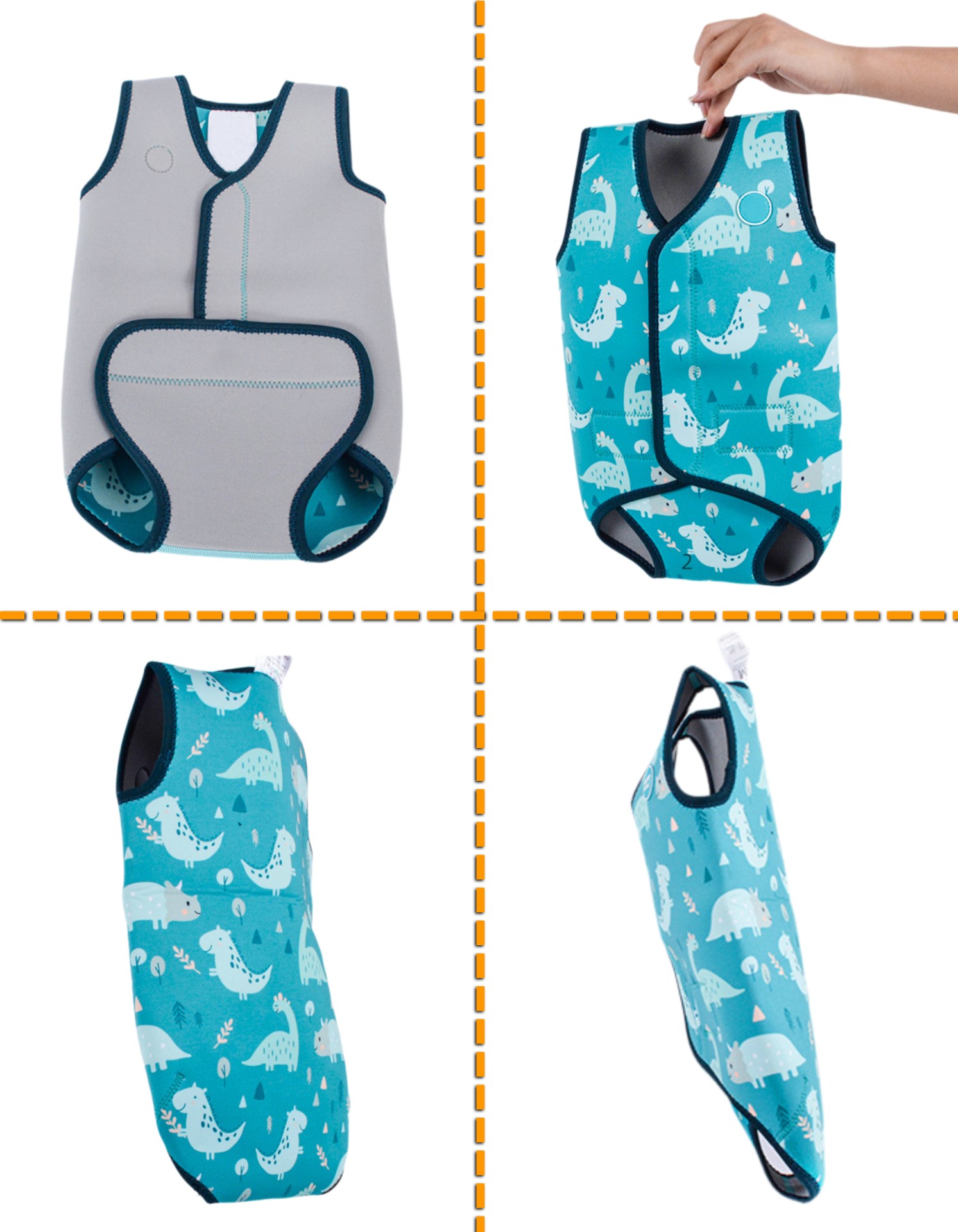 Уникальный и простой дизайн костюма позволяет легко и быстро одевать малыша перед купанием.